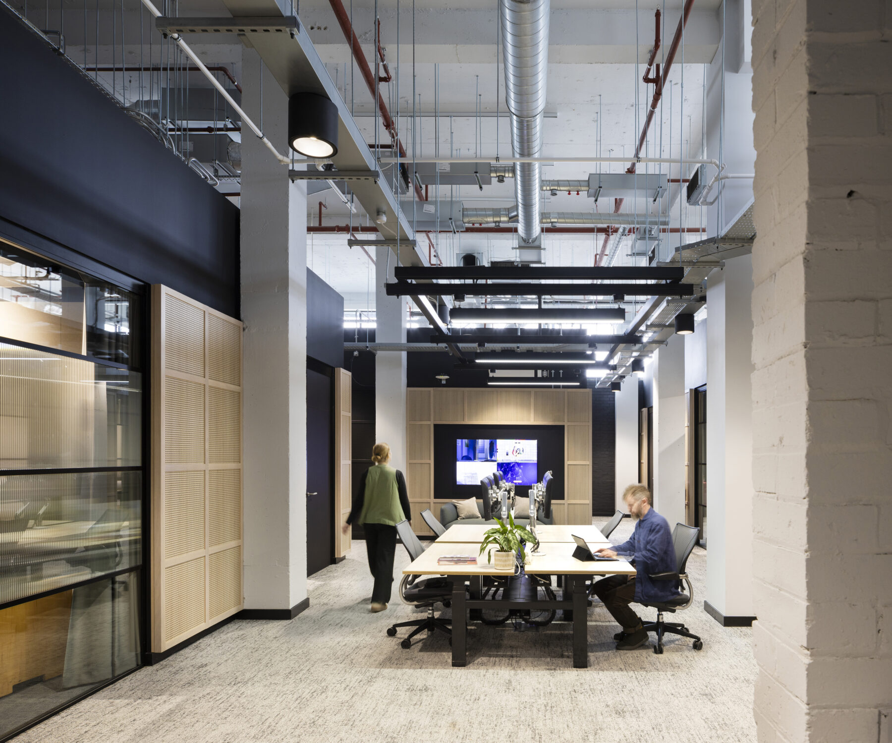 Acoustic screens introduce some warmth to the industrial palette and help create an acoustically comfortable open plan working environment – a key part of the client brief. The expressed frame takes inspiration from the original stage sets designed and fabricated in the warehouse.