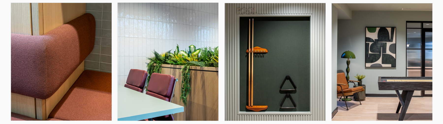 The spaces designed by AWW include an entrance lounge, games room, media room, work lounge, event and flexible space, and a garden room. A warm, complementary colour palette was developed to ensure the interiors felt inviting and domestic rather than stark, allowing the amenity spaces to feel like an extension of residents’ homes. This palette was carefully aligned with the operator and building brand to create a cohesive identity throughout.